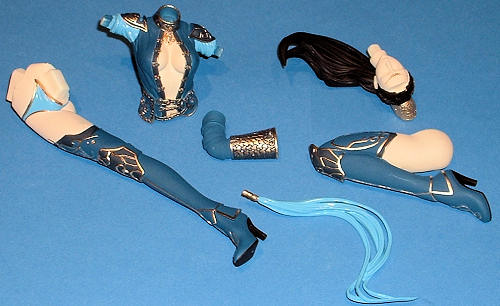 The odd weapon was then painted, decaled, and assembled. Here I drilled a small hole in the end of each segment and screwed in the connecting chain bits. Everything at this point was glued together with the exception of her head, as I still had the most frightful part for me to paint…her eyes. These can obviously make or break a figure kit, so I took my time working from the photos. Finally, with a little glue, she was no longer headless and, in fact, complete.
