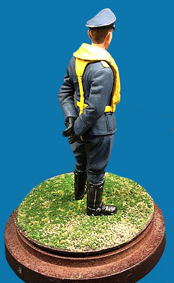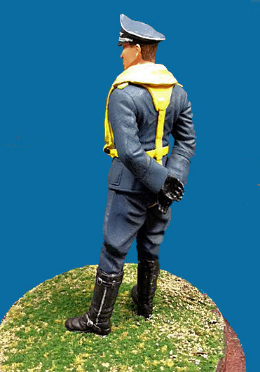 For most of the other parts of the figure, I primarily used relatively inexpensive flat acrylic paints. For Galland’s Luftwaffe uniform, I was able to find what I think is the perfect match for the blue gray color: Americana Deep Midnight Blue (again, I use relatively inexpensive acrylic craft paints from Walmart, Michaels, and Hobby Lobby) I painted the life vest and its straps with Americana Saffron Yellow. For the boots and flying gloves, I used Apple Barrel Jet Black, and when this was dry, I brushed on a coat of Testors Glosscote Lacquer to give these uniform items a shinier leather look. I also painted the visor of the figure’s service hat in the same manner. Finally, I used Testors Aluminum to pick out the insignia on the figure’s service hat.