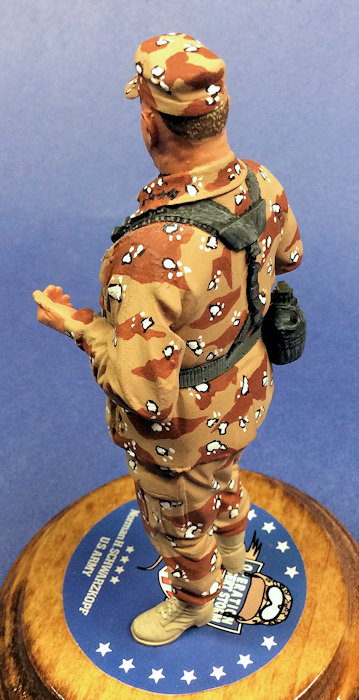 For most of the other parts of the figure, I primarily used relatively inexpensive flat acrylic paints. The desert camouflage uniform was particularly challenging. I used a base coat of Craftsmart Golden Brown. I used Americana Burnt Sienna for the darker brown splotches on the uniform. And now the tough part: the white splotches. These are outlined in black, so it takes quite a while to paint the random white splotches on the uniform, cap and helmet, and then to delicately outline them with flat black. I went back and forth on these by widening the inside white paint and then using the Golden Brown and Burnt Sienna to get to a point where the black outline looked to be about the right width.