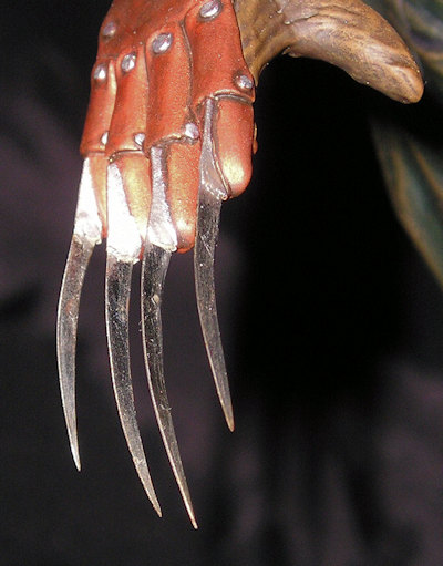 Now it was time to give Freddy his famous knives. I cut the knife blades from stainless steel sheet using my trusty old Dremel™ scroll saw and a lot of motor oil to keep the blade cool. I then filed them to final shape, gave them their edge and polished them. I attached them to the appropriate hand with cyanoacrylate and blended them into the glove with A/B epoxy putty. Now, finally, I was ready to put it all together. I assembled the parts using pins for strength and two-part, five minute epoxy, filling any seams with Bondo™ surfacing putty and smoothing it with acetone. I kept the hat separate. Once assembled, the entire figure was washed with a soft brush and several good spritzes of Windex™ to remove any oil or grime and rinsed well with water. I masked off the knife blades with a couple of coats of latex mold building compound and primed the kit for painting with two coats of Rust-oleum™ white sand-able primer. The first coat is to reveal any flaws I may have overlooked. The second coat is to provide a hard, permanent surface for the acrylic to adhere. Here’s a tip; how can you tell when the primer is dry completely? When you can no longer smell paint with your nose close to the surface, it’s dry and good to go.