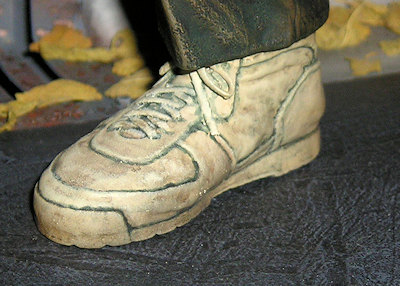 The first step in customizing this figure was deciding which kit parts could be modified and which had to be fabricated from scratch. I decided that Freddy’s tennis shoes needed more and better detail so I filled the kit’s vinyl shoes with Sculpey™, made RTV silicone molds of them and cast copies in resin. I removed the laces from the castings and refined the detail in the shoes then added eyelets punched from styrene sheet and laces made from strips cut from an old silk scarf. Once the shoes were complete, I drilled into the soles to glue finishing nails into them and mounted them to wooden blocks for painting. The finishing nails would later be cut from the blocks and used to securely mount the figure to the base.