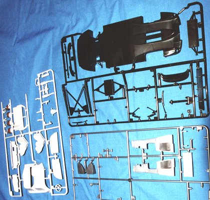 The kit is presented with a number of different coloured sprues as seems typical of Tamiya’s line of cars and bikes. There are two grey sprues, one black and one clear. The tyres are rubber and are presented as a rear and front set, remember that this car is race-bred and as such has race tyres! The body of the car is presented as a single molding with the two door panels presented on one of the other sprues.