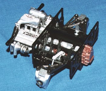 Once the suspension and inner walls had been attached to the motor the completed assembly was attached to the subframe pan, which has by now been painted with Tamiya X-18, Semigloss black. The back under section of the chassis is painted with Tamiya X-10, Gun Metal and the front apron is painted with the same colour as the body, in this case it is Boyd enamel 52703, Chezoom Teal.
