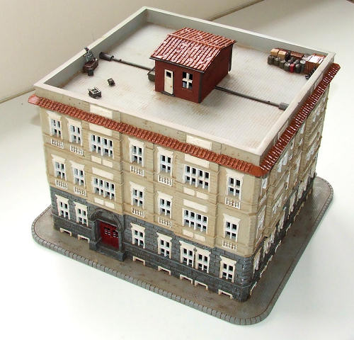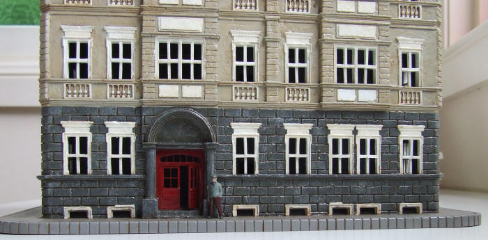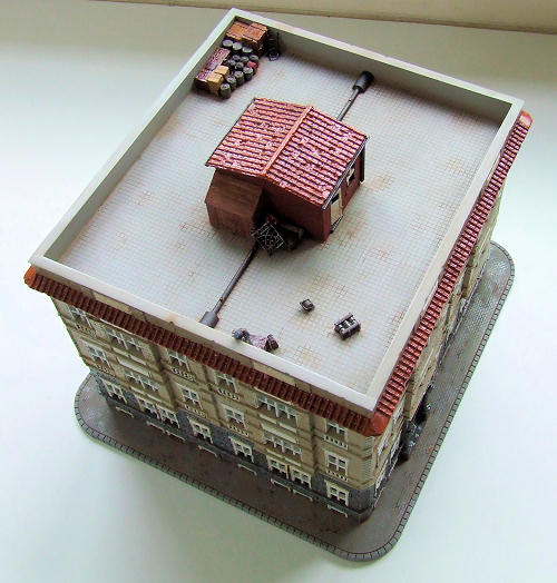 My other concern during construction was the very simplistic hut that sits on top of the building. At best is could be described as four concrete slabs with a terracotta tile roof. I think it’s just a lazy afterthought by Italeri – there is little to suggest that this box represents any genuine architectural feature. I ditched the walls and replaced them with brick structures sourced from the second-hand buildings bin at my local model railway shop. These were trimmed so that I could still use the much more convincing terracotta roof, albeit at a steeper angle. For interest I added a little wooden lean-to on the side and some guttering to the roof – there is also no plumbing included anywhere in the kit. I think these steps made for a much more convincing addition to the very visible top of my Berlin house; you could alternatively add a trapdoor arrangement or some other means of rooftop access. At the other end of my building I sourced some paved footpath sections – again, model railway fixtures – and assembled them to match the dimensions of the house. These were glued to the bottom of the structure to raise the house off street level, but I won’t berate Italeri for not including this feature.