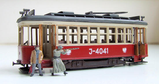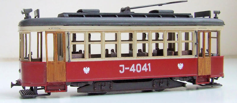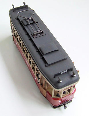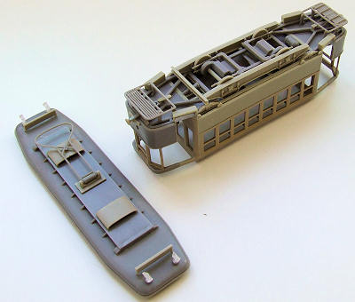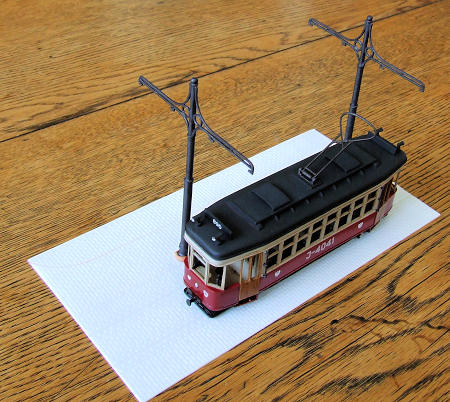 I assembled the passenger seats but left these and the interior grab-rails off until after the interior walls were painted; ditto for the doors and external handrails. In fact, the only real assembly problem I found with the tram was after painting, when the doors would not fit into their allotted spaces without some slicing, and the window frames on the side of the cab were simply too large for the place they are intended to occupy. In fact, the most fiddly construction step was building the two tram-line poles, which required a lot of careful sanding to keep relatively round and not to lose the moulded-in detail.