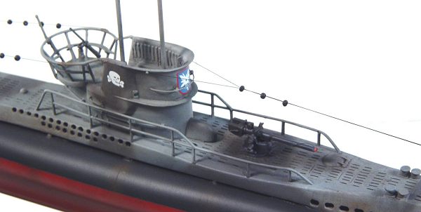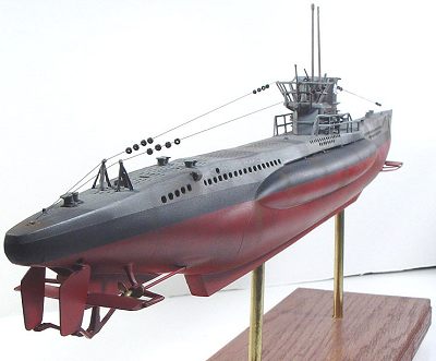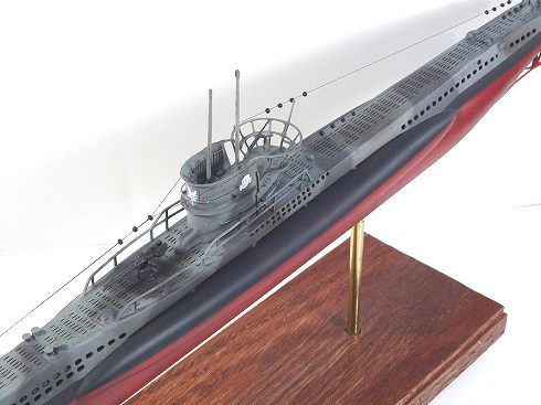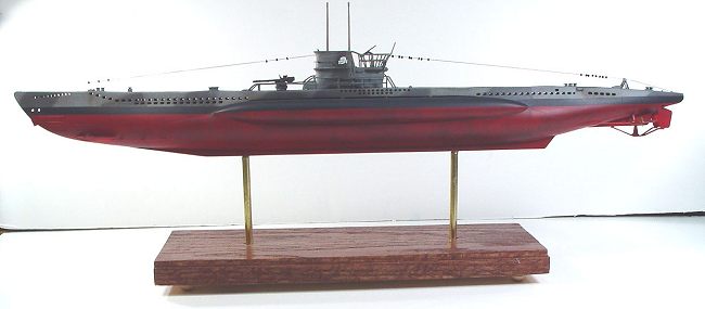 The stand is just a piece of scrap oak beveled with a router then two holes drilled into it with door hinge pins inserted in the holes. It cost about a buck fifty and doesn’t look that bad. I know there are many out there that know more than I do about this subject. Go easy on me. It is my first U-boat!