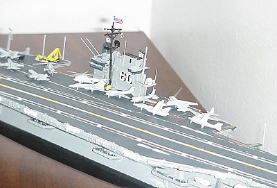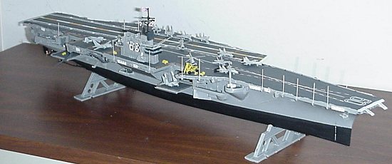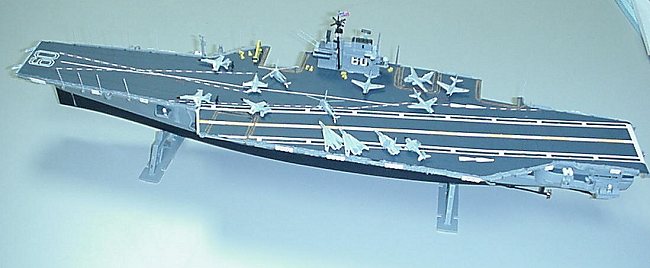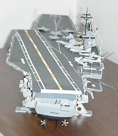 Revell's model has been around a long time. My instruction sheet is copyrighted in 1989 and it is still in the catalog, as I saw three of them arrive at my local hobby shop last week. The model represents the Sara after an overhaul probably in 1980 at the Philadelphia Naval Yard. The model comes with Sea Sparrow launchers, Phalanx close in weapons and and modern aircraft such as F-14 Tomcats, F-18 Hornets and A6E Intruders. A problem may be that the fight deck was re-configured in 1962. As you can see from the view of the real ship, the triangle area forward of the port elevator is missing and the layout of the flight deck is different. So perhaps the newer planes and
