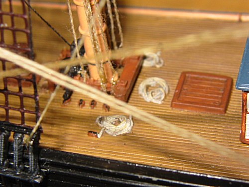 If the sails are gone, what do you do with the lines that are supposed to be attached to them? Most ship modelers will install them if possible, tying them off at the yard. (Lines that go from the sail directly to the deck are often omitted, such as staysail sheets.) On my model, I deleted all the sheet lines, and added those lines mentioned earlier from the fife rails to the yards to simulate the buntlines and clewlines that would normally be there.