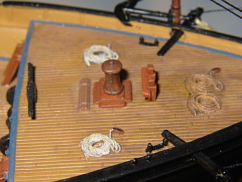 The decks have the slightly annoying molded- in pulley blocks and coils of line. No clipper skipper worth his salt would have allowed these lubberly messes to be strewn about the decks of his vessel! I decided to leave them in place, as I didn’t want to have to deal with all the missing planking detail that would result if I tried to remove them. I did, however, remove the coils from smooth surfaces such as the roofs of the deckhouses. To paint the ones that remained, I used a color that most closely matched the tan of my rigging line. The rope detail was highlighted by the same dark wash used on the rest of the deck fittings.