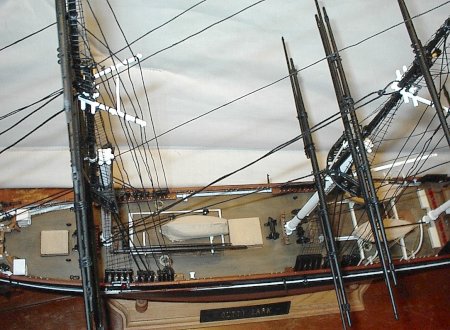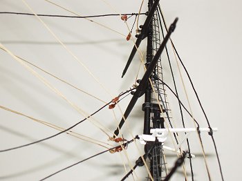 Then I began the running rigging using the tan thread. For these lines you need to also install the blocks and run lines through them down to pinrails. This is where it starts to get hairy because you are weaving lines around and through some areas that are hard to access and then you have to loop the line around belaying pins and it gets difficult. I used CA glue to help me secure lines at the deck level and used the Elmer’s/ water mixture to strengthen all other knots at yard ends and mast tops. Don’t even try this stuff if you had a bad day- your hands must be steady and if you move to quickly, you can knock a yard off or break something off while trying to get into position to thread or tie a line.