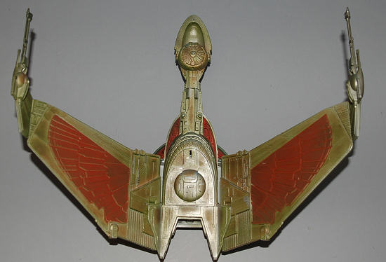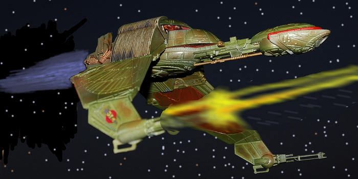 Two wings extend forward from the main hull in an aggressive posture, tipped with phasers (hey, didn’t the Klingons use disruptors? Hmmm.) and some sort of cannon. It also has a single Photon torpedo launcher in the beak, just in case you need to really blow some stuff up. Yeeha.