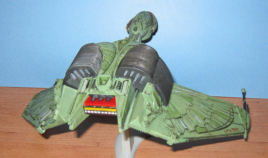 I then tackled the wing hinges which consisted of three pieces. I opted to put my Bird in attack mode which means wings down. Some of the really serious SF modelers claim that the wing angle is too much and they should be sanded down a few degrees. I didn’t bother and left them as is. Of course, if I were really lazy, I could have just glued the stand together and “modeled” it in cloak mode (bad SF modeler joke)…