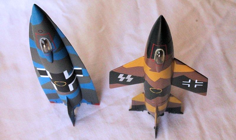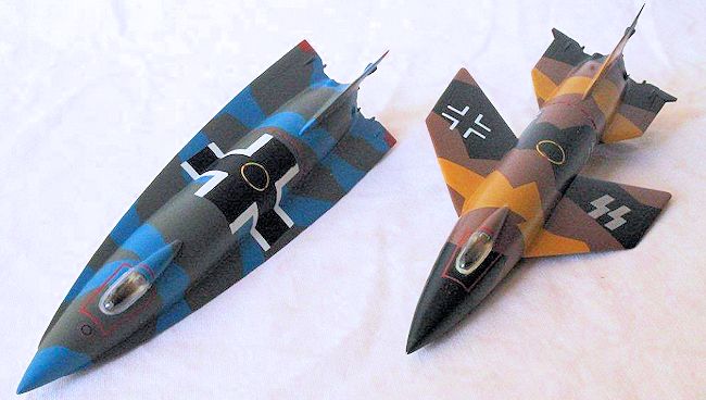 Both models had a red rectangular outline around the cockpit. These had to be built-up from two ling straight lines, and were no problem. But I slipped-up with the circular decal on the spine – I put them in a slightly different position on each model – Rats!! No weathering was done on them as each is/was a one-use machine. However, I did put a black wash into the connecting ring that I’d improved. A clear satin coat later, and I’m in the home straight.