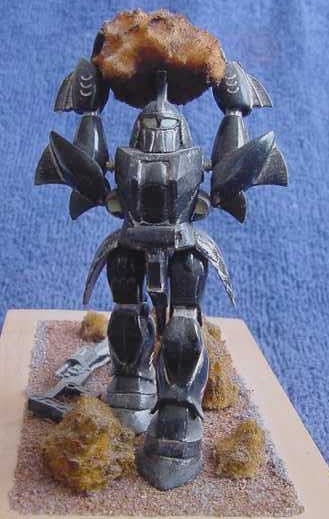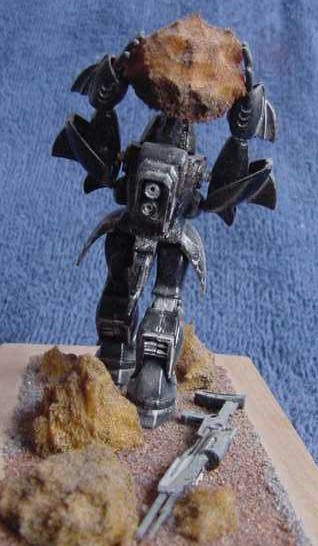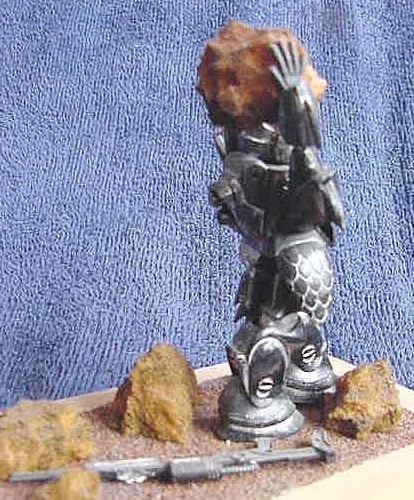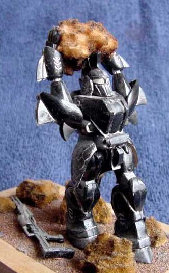 I now brought the sub-assemblies together – body & head, two arms & boulder, both legs and the gun. The two thigh-plates were added and the robot was complete. My only problem was that the boulder fouled the crest on top of his head. OK, trim the underside of the boulder a bit.