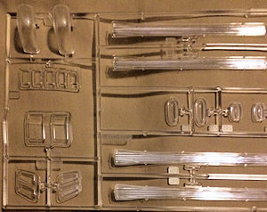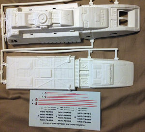 The kit is basically what I remembered. Star Trek kits are simplicity of easy and this one is no exception. It contains nothing more than the main fuselage halves, divided top and bottom. The two warp nacelles, various parts for the wings and the navigation deflectors and eight parts for the long range sensor array. The clear parts includes all the windows and the clear warp expellers and bussard ram scoops. All in all, around 35 parts, that’s it!