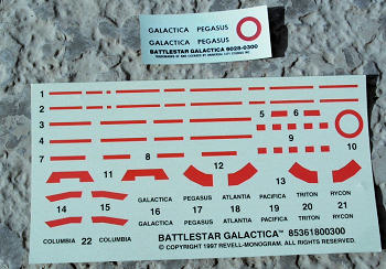 The 1978 release kit number 6028 is moulded in Silver plastic and comes with decals for the Galactica and Pegasus and a single red circle that goes on the top of the Battlestar. The kit was in a box that measured about 20x10x2.5 inches. The box art is a photo of the model against a star field