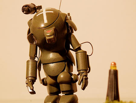 Bumbling about in a powered suit looks good in anime, but is probably quite unrealistic. This egg thingy being a scout is somewhat laughable, though interesting, as I do believe it gave way to the Elementals used in the Battlemech series, where powered suits were used to great effect.