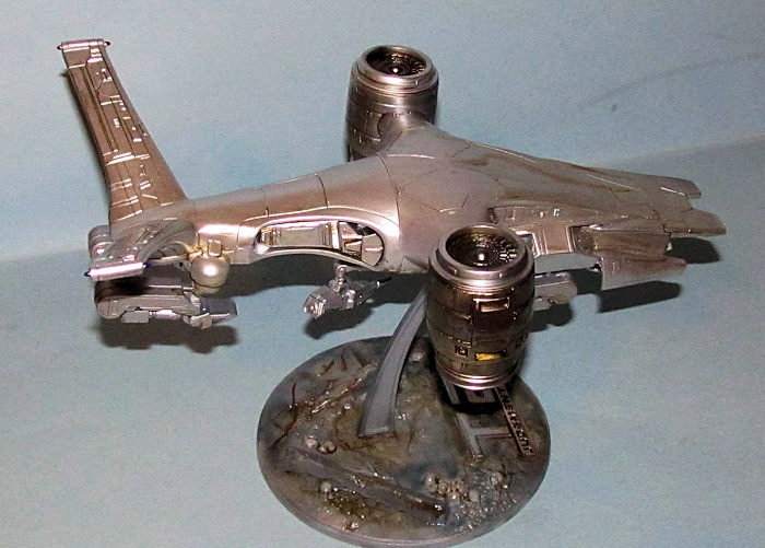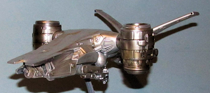 The landing feet and main plasma gun were glued on and the engine pods were inserted into the rotating swivels. Finally the completed HK was mounted on the painted stand. That is all.