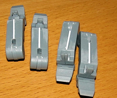 The forward landing legs didn't have the best fit because the attachment pin nearest the landing foot/pad is too long and needs to be trimmed a few millimeters so the landing legs can go together without a large seam. There were some ejection marks on the landing feet and guns that needed to be filled and sanded. Not a big deal, but annoying. I took care of the landing leg bottom seams with some CA glue and used cut plastic card and strip to deal with the rest.