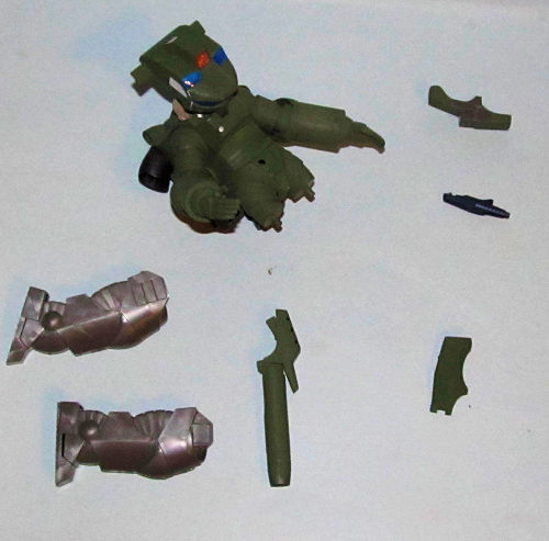 The legs weren't any easier as I had a moment when I forgot to add a polycap in the left leg. In my haste to add the necessary polycap, I snapped off part of the upper thigh off at the pivot. I spent a few minutes swearing and them calmed down enough to glue the broken piece on and fill the gaps. I sanded seams on both sides of the leg, but I ignored the bottom of the feet as no one was ever going to see them and I just about had it with filling/sanding at that moment.