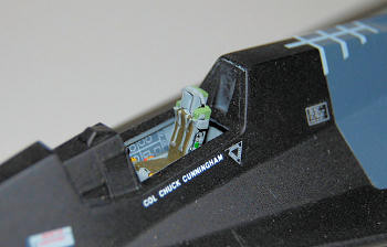Once dry and the masking tape removed I glossed the jet for decal application. Now here I varied from the kit decals. I used them along with decals from my spare and half used sheets and came up with the markings I liked. The tail markings came from a 1:72 super scale A-7E set I had left over, I finished the jet with Testors Dull Coat and glued in the landing gear, and bay doors. Then on went the vertical stabilizers and the ramjets.