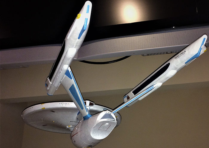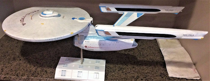 This thing is BBBIIIGGG! Over 32 inches long and there was hardly any place to put it except in the basement right below the basement tv, where the photos was taken as my normal methods will not contain something this big! It is an “eye drawer” to say the least! Again, not everyone will recognize the B, C or E. But everyone, or nearly everyone will recognize this and the D! Several friends who are trekkers have already taken a photo of this. This ship is long since out of production. eBay is asking around $500 min. right now and it cannot be found on round 2’s web site. Some model shops, like my local one still has it along with the original Enterprise……Might be a good idea to pick up another one in order to earn some money? Hrmm…..Might not be a bad idea!