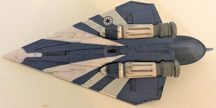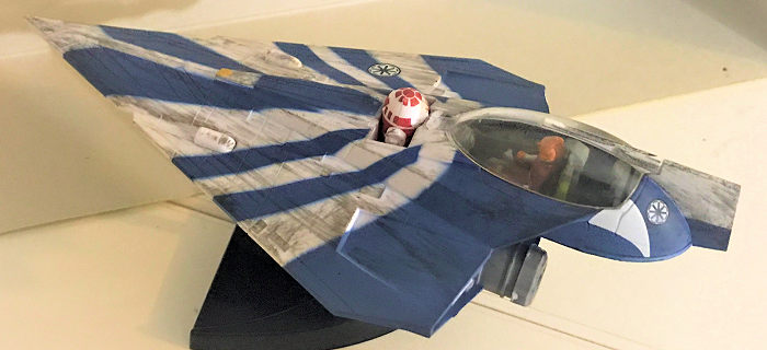 The kit contains a rudimentary cockpit, with a Plo-Koon figure. Now, the canopy can be opened or closed if you read the instructions carefully but I elected to cement this shut with the figure inside simply because I KNOW my son eventually will snap the canopy right off if left operable. The other piece of figure is a small R2 unit that you can snap in front of Plo-Koon in the droid slot/socket. My son really like this little guy but I keep it in his slot cause again, he will lose it if you leave him to his own devices. The only really nasty part of the kit that you need to watch for is the back end slot. This piece goes onto the top of the rear end piece. Be sure it is snapped on tight or else you will not be able snap on the bottom hull piece. This is basically the only nasty spot. The rest snap on without a fuss and the fit is tight. I didn’t use any filler on this kit.