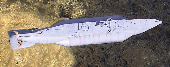 I painted the interior of upper deck in medium grey while the rest of the X-craft was overall dark ocean grey ten added stains at the sides in way of drains. The aluminium bronze propeller was painted in bronze colour. The kit was finally given an overall airbrush coat of semi matt clear varnish, Revell brand.