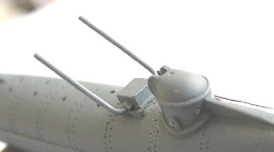 The stern rudder and propeller arrangement were built after some cursing and test fitting from the provided parts and wire using CA glue. For the snorkels I preferred brass tubing to the kit parts, which bent into proper shape with amazing ease.