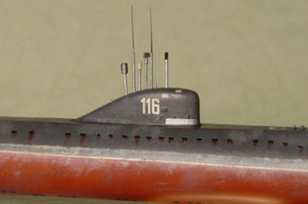 Detailing was then picked out with Humbrol paints; flat black for the hull free-flooding holes and silver and grey for the various antennas and periscopes.