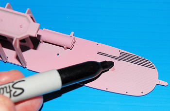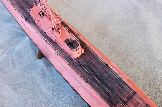 The decks were painted with a non-skid black in the film, but I used a weathered black and gray finish to better simulate the war-torn look of the submarine, by washing the segments over and over. If you want to do the strict movie version, a sharpie marker would be the best approach.