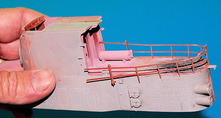 The railings on the sail do need special attention. The rear is made out of three formed plastic pieces. Glue the starboard side on first, then the rear, then the port. Test fit everything six ways from Sunday, because the fit is not so hot. Worse, on the bow section of the sail, you just get the uprights. Revell does include some very nice rigging line with more kinks in it than a gay pride parade, but using wire or stretched sprue would be much, much easier. I carefully threaded the right diameter of sprue through the rail fittings, and then glued them in place to the sail location points using ac glue and accelerator.