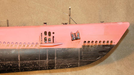 The hull is battered and starting to rust, so they have to use what paint they can scrounge up ( with the nefarious help of the wily supply officer), twelve drums of lead white, and eight drums of red, hence the pink colour. Since the submarine was so light in the water, the hull line is much lower than it would be normally, and they are attacked before they can get the over coat of gray on, much to the chief’s chagrin.