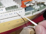 (he has a simple way of making wood decks look very convincing. The complex vertical structures should be prepainted, portholes, doors, etc. before gluing them in place, the whole thing goes together somewhat like a layered cake, and you want to make sure to put in as many of the small railings during the assembly as possible ( I did not, much to my regret).