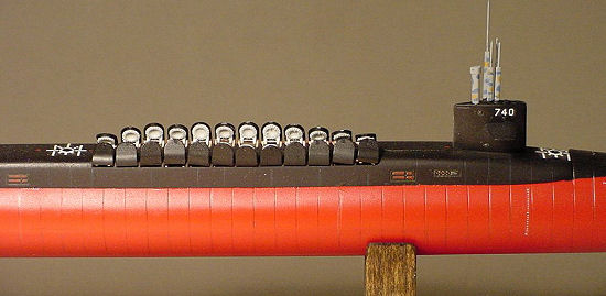 I decided to leave the masts off until the end, so step 1 was shortened and it was off to the spray booth to paint all the little missile caps, hinges, and other fiddly bits. One thing, when you realize how many missiles this beast hauls around, and what each one can do, you get a definite sense of sea power! The first four tubes can be displayed with the missiles whole, and you have to choose between the early version of the Trident missile package, or the second (current). Likewise, the torpedo tube section can be built open or closed (please, don’t glue the torp half in and half out).