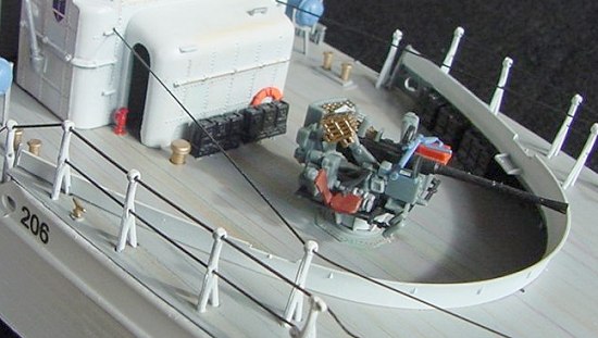 The main deck is awash with little goodies…ammo cans, stanchions, and hatch covers…grit your teeth and go to it ! I painted all of my details a different colour from the general grey of the deck, so as to stand out a bit…weathering can help a lot here also. Painting as you go during construction is a must with the 815, once you have everything up, you won’t be able to reach a lot of the areas that need to be detailed…luckily, the instructions point this out by giving you colour recommendations at every step.