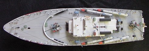 Leave off all of the masts and antennas on the three upper deck sections until they are installed on the hull…you will only snap some off if you follow the directions. I did. Once you have the main deck, upper wash deck, and bridge in place, you can begin adding on the smaller detail items working from the center of the boat outwards…I left the stanchion rails until the very last. Chain is included with the kit for the fending/egress lines, but I used cord, as the chain looked very out of scale. Stretched black sprue was used for the rest of the safety lines surrounding the deck, wire could also be used. Refer constantly to the front of the instructions for rigging, and the boxtop…quite a lot of the locator areas are easy to miss.