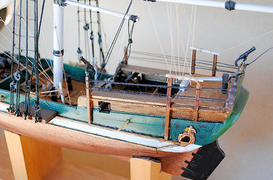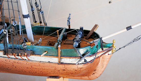 Most of this kit, other than the original hull and the metal fittings, was made from dowels, toothpicks, doll house furnishings, bits of scrap wood, and whatever else I could scrounge up. The sails are made from cotton tight weave that was found at a craft store.