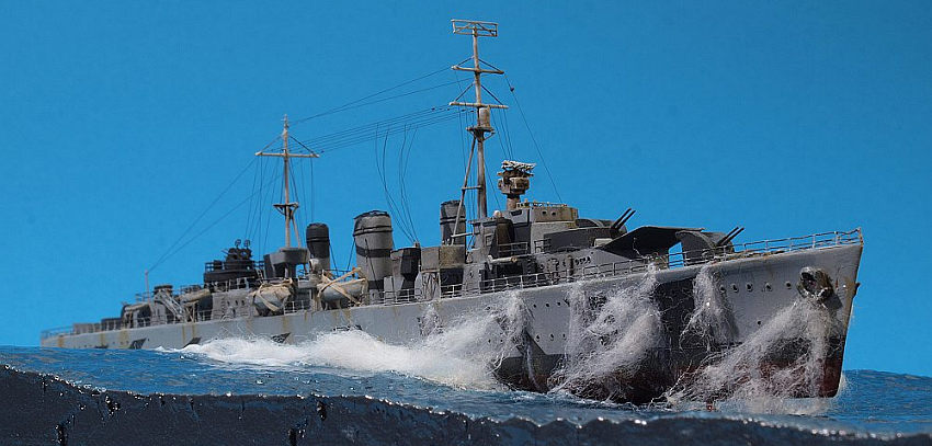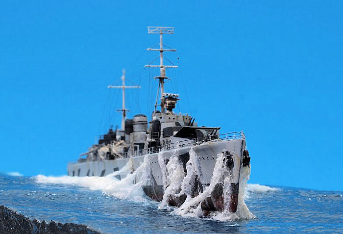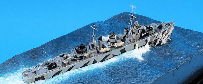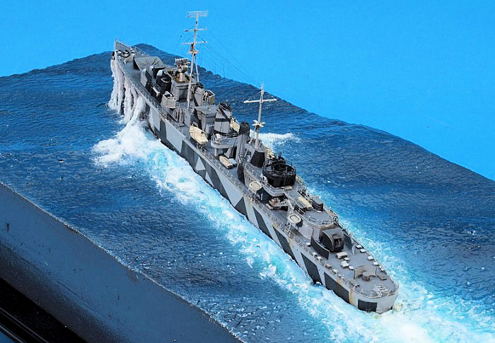 This was mainly routine work, even though the multiple AA guns were fiddly builds. My two challenges in this project were painting a really intricate splinter camo and replicating a ship in heavy seas.