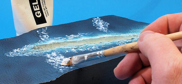 I stippled white wall paint on the base to achieve the desired surface texture. After drying, I sprayed one shade of green and three shades of blue with my airbrush. That made for both a credible overall colour of the sea, but also for a smooth transition between undisturbed and disturbed water. White artistīs oil paint was used for further highlighting.