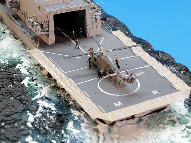The base was made very early in the project, using a piece of 40 mm insulation foam board, cut to size and a cutout provided for the hull. The base was then carved into the approximate wave and wake pattern, sanded, puttied and sealed with white wall paint, applied in a stippling motion. Green and blue acrylics were sprayed to get the proper shades. After a thorough curing time, the base was sealed with solvent based clear gloss spray paint from a rattle can. That cured, some drybrushing with white artist´s oil paint and some effect with clear gloss acrylic gel completed the project. I plan to yet add a machined brass barrel to the gun once available.