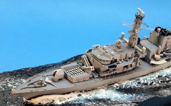 This model was built from the 1:350 injected plastic kit by Trumpeter. It is a very nicely produced, well-fitting kit, with some (rather uber-delicate) PE, and builds really well. There are some glitches, though, most notably the absence of the new style „Kryten“ gun turret, even though shown on the boxart. The 30 mm guns are the older style, too, so basically this is the original HMS Kent kit issued in 2012, with different markings only.