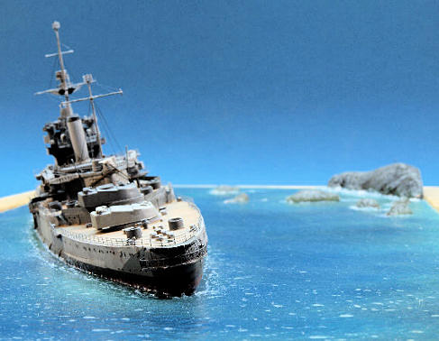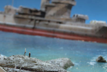 Having painted and weathered them, a really final flat coat was sprayed, the vessel left to dry, and the next morning it was mounted on the base as described above. Some more acrylic gel was applied from a disposable syringe, which was sculpted using an artist´s spatula. After curing, some drybrushing with white artist´s oil paint completed the work on the water. Now the threaded bars were removed and the two missing turrets finally glued to the model. As a final touch I added two PE figures to the coast, plus two PE bicycles which are very hard to notice at all. My idea was to show two youths having cycled to the coast to have a look at the stricken battleship.