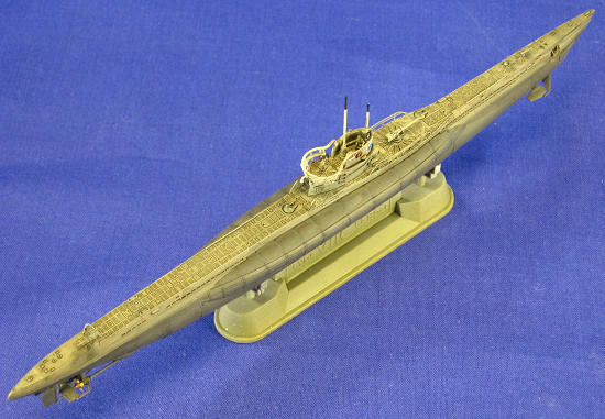 After wiping the model down with Polly S Plastic Prep I sprayed a primer coat of Mr. Surfacer 1200 onto the sub and then checked all of the seams, as tiny as they were. I next pre-shaded some of the panel lines with Tamiya Flat Black XF-1, and then lightly sprayed some Testors Acrylic Gunship Gray (FS36118) on to the lower hull areas below the waterline, letting the pre-shading show through. That was masked off, and then I sprayed Tamiya XF20 Medium Gray lightly above the waterline.