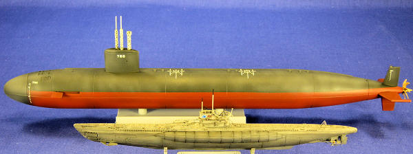 One thing that surprised me upon opening the box is how small the kit is, and thus how small a real U-Boat was. A few years ago I built a DML/Dragon 1/350 Los Angeles Class submarine model and in comparison it positively dwarfs the U-Boat (see image at the bottom of the page. Ed). That such a small vessel could wreak so much havoc is something worth pondering.
