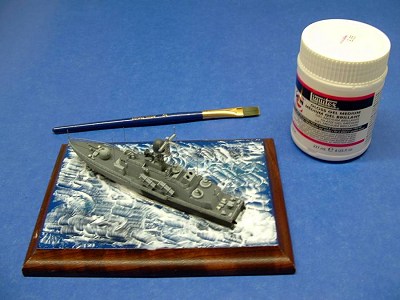 I chose to display the model underway at higher speed. I used an old plaque backing for the base. I started by painting the base with dark blue enamel. When it was dry, I added the illusion of depth by airbrushing black and lighter shades of blue. I attached the model with two-part epoxy. I then used acrylic gloss medium to create waves and turbulence. This took several coats to get sufficient relief along the hull and in the wake. I then used the base color of blue successively lightened with white, finishing with semi-gloss white in the wake, to add and blend in the wake and frothing along the hull.