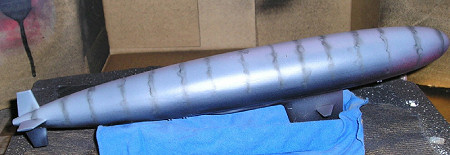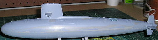 Seems no matter what I did, I couldn’t make that darned line disappear, but I tried as best I could, using increasingly finer grades of sanding cloths from MicroMark. When I thought I had gone as far as humanly possible, I proceeded with the remaining construction, gluing the sail halves together, which fitted fairly well….. no filler required. I glued this to the upper hull using model cement. The sail planes and stern planes followed, and construction was pretty much completed, then I glued the display stand together. All was allowed to dry thoroughly for a day, then washed again with dishwashing detergent and warm water to remove all the sanding debris from the model. I dried it with paper towels and used a hair dryer to get it completely dry, especially in the reactor core opening. This had previously been painted flat white with blue water intake lines, yellow steam lines, and green waste water lines. On to the paint shop.