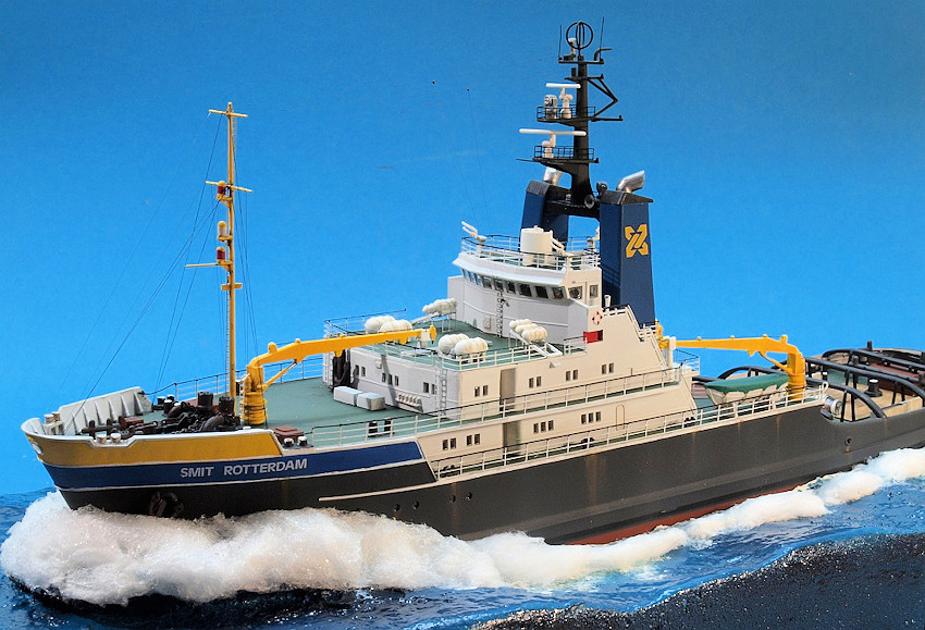 The two oceangoing tugs Smit Rotterdam and Smit London were built in the Netherlands in the mid 1970s. About 75 metres long and with engines rathed at 22,000 hp, they could be deployed worldwide to assist vessels and work for the offshore industry. They were equipped with comprehensive towing gear, workshops and firefighting equipment. Both ships had a long career and were broken up in India in 2012/13.