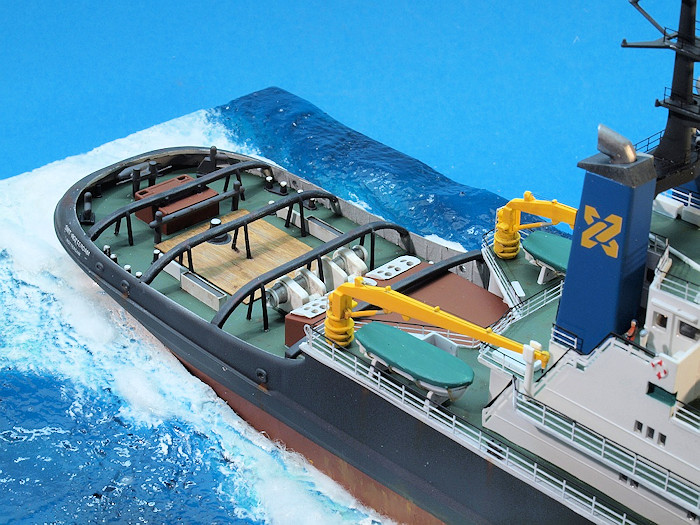 Cotton wool is an obvious choice for simulating something frothy, fluffy and churning as water displaced and thrown around by something as massive as a ship pounding its way through it. Nonetheless, wool alone does not look quite right. So I added sections of cosmetics wool of the right size and fibre flow to the base using clear gloss acryliv gel. The same gel was very carefully stippled onto the waves to blend them in and arrive at an irregularly glossy or sparkly surface structure. I found out that carefully ading Klear to the bow wave improved the effect a lot, and adding more gel to the stern wake with a brush improved the effect there.