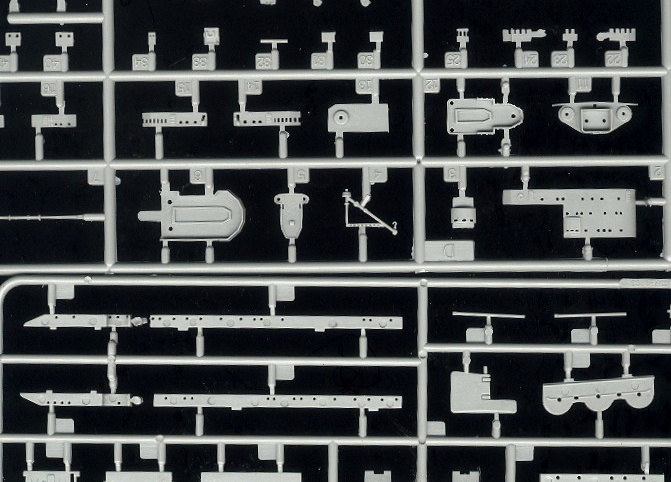 offering is molded in light gray plastic and consists of 375 parts packed in the now common sturdy box.. It is obviously a one-half scaled down version of their 1/350 scale Sara. Among the parts are 6 Great Lakes TG-2 torpedo bombers, 9 SBU dive bombers, 9 Grumman F3F fighters, and 9 BFC-2 Goshawk fighter-bombers. The aircraft and their accessories are molded in clear plastic and packaged in a separate box inside the kit box.
